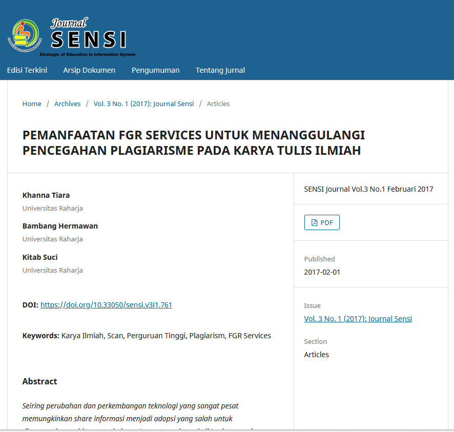 Scientific Journal Co-Author - SENSI Journal (February 2017) Co-authored a research paper titled "Utilization of FGR Services to Mitigate Plagiarism in Scientific Papers". Published by Universitas Raharja, the study focuses on leveraging technological solutions to scan academic papers and prevent plagiarism within higher education institutions.